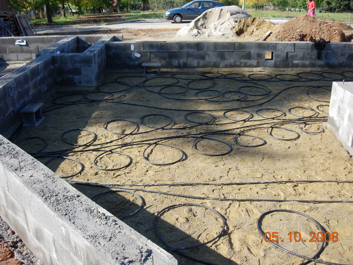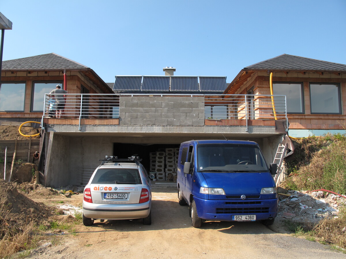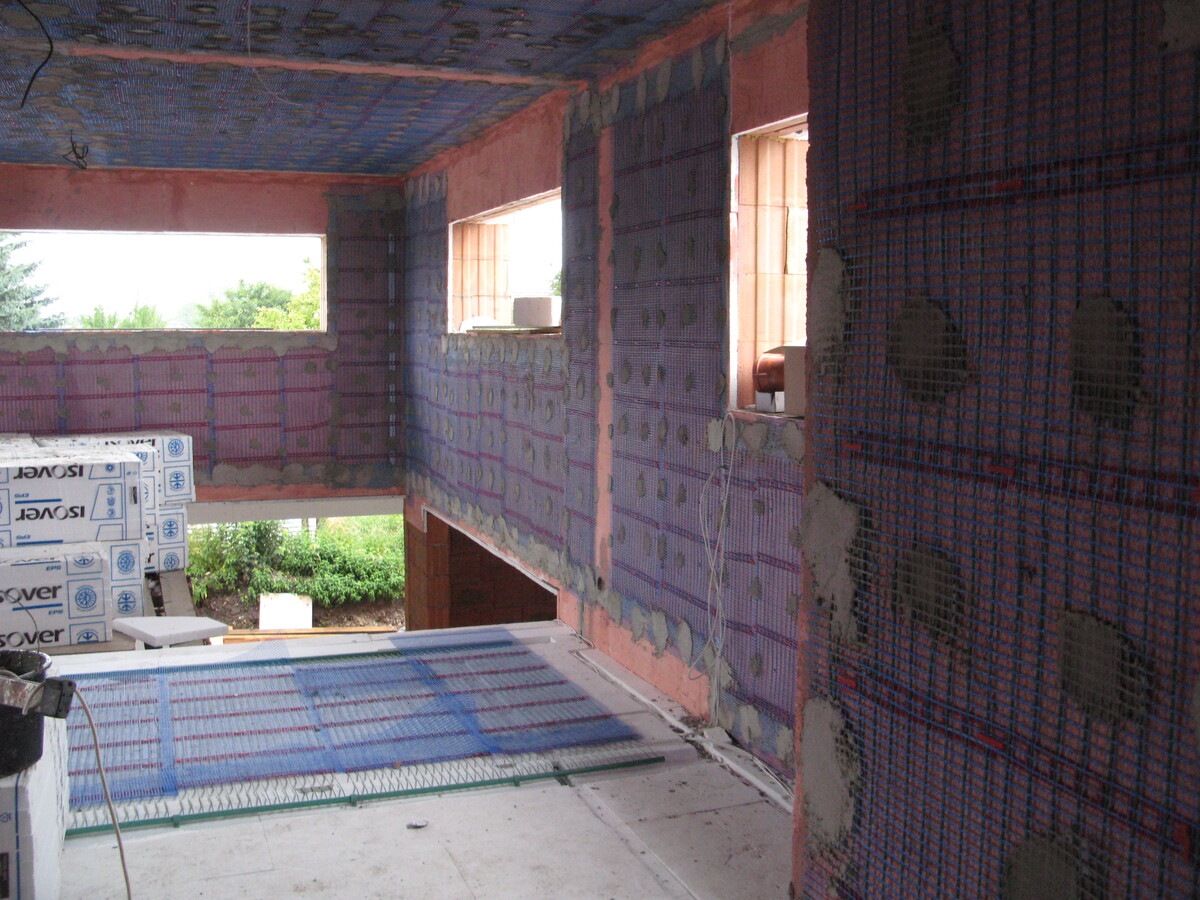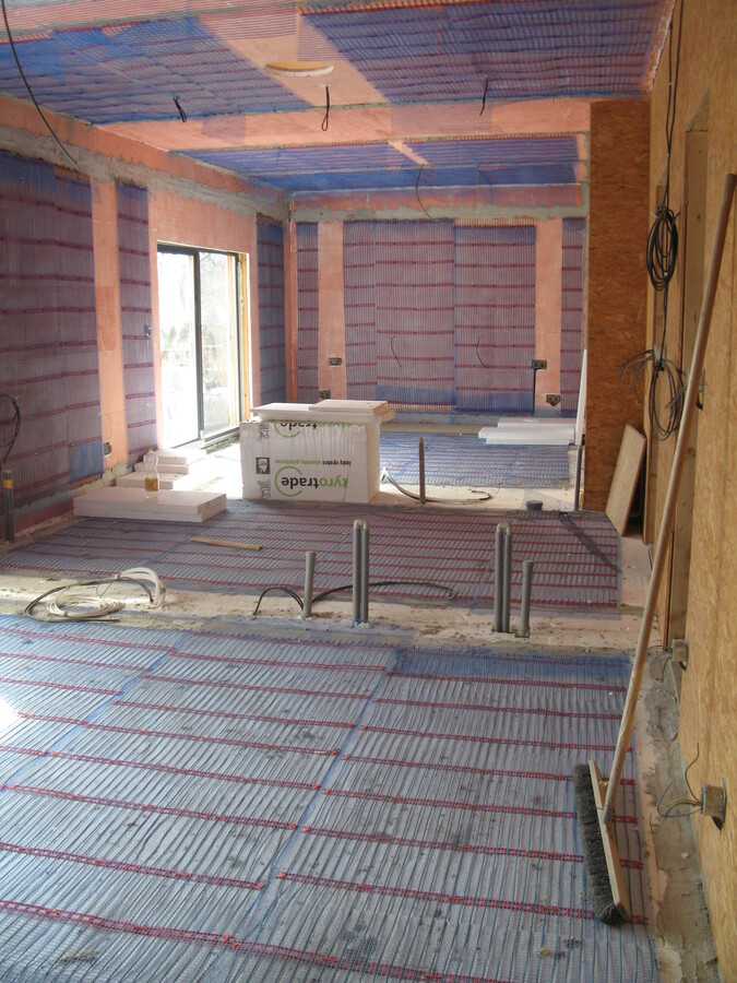 Plnoplošná instalace kapilárních rohoží, solární kolektory, tepelné čerpadlo země/voda, zemní akumulátor pod základovou deskou rodinného domu.