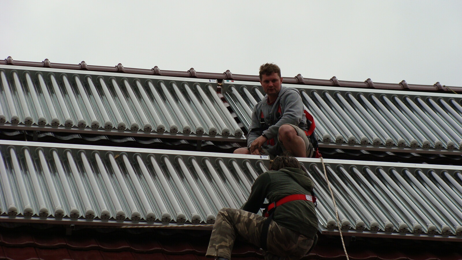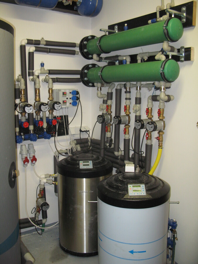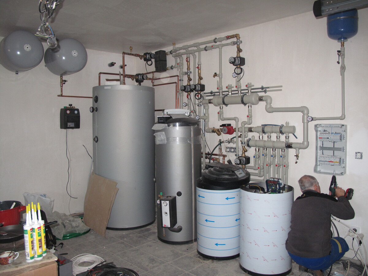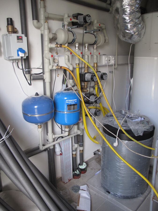 Plnoplošná instalace kapilárních rohoží, solární kolektory na otočném stojanu, 2x tepelné čerpadlo voda/voda