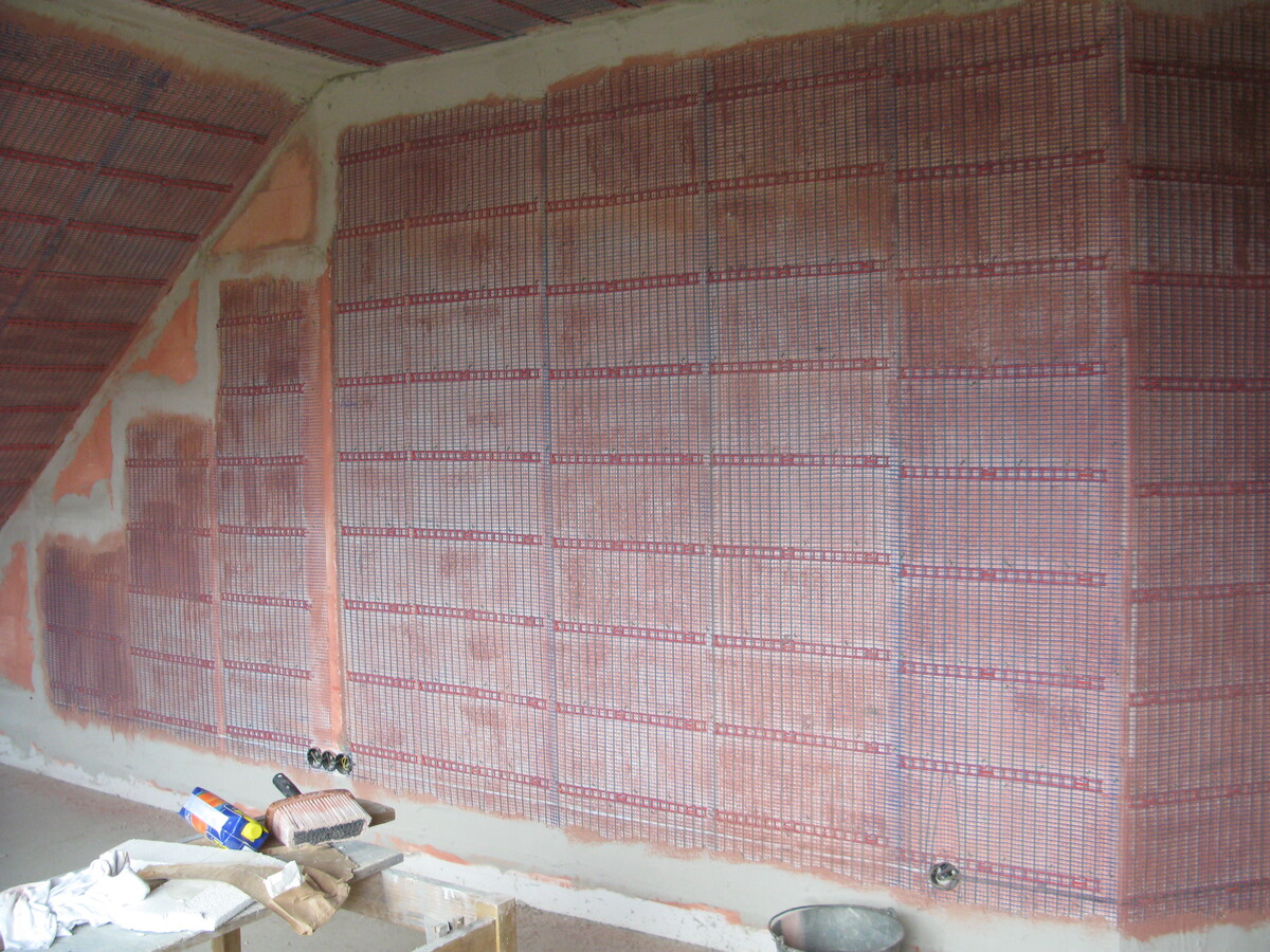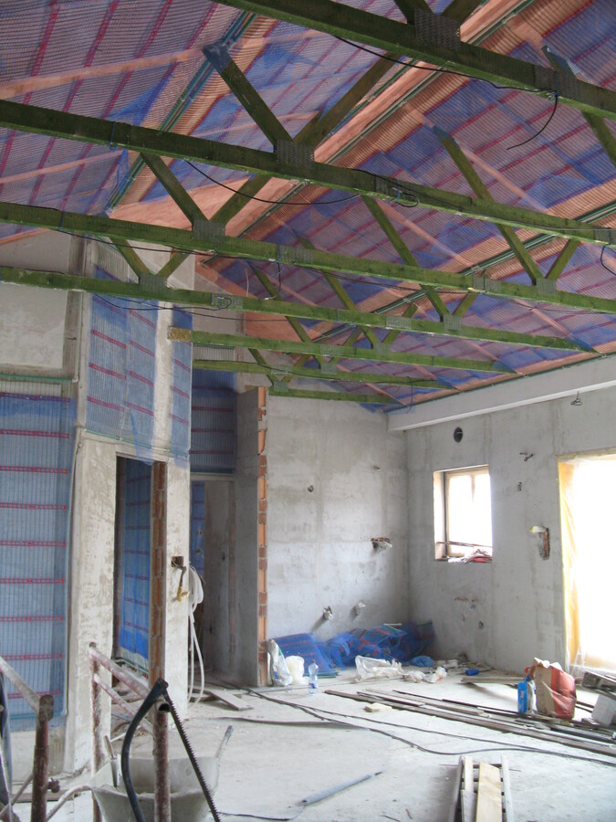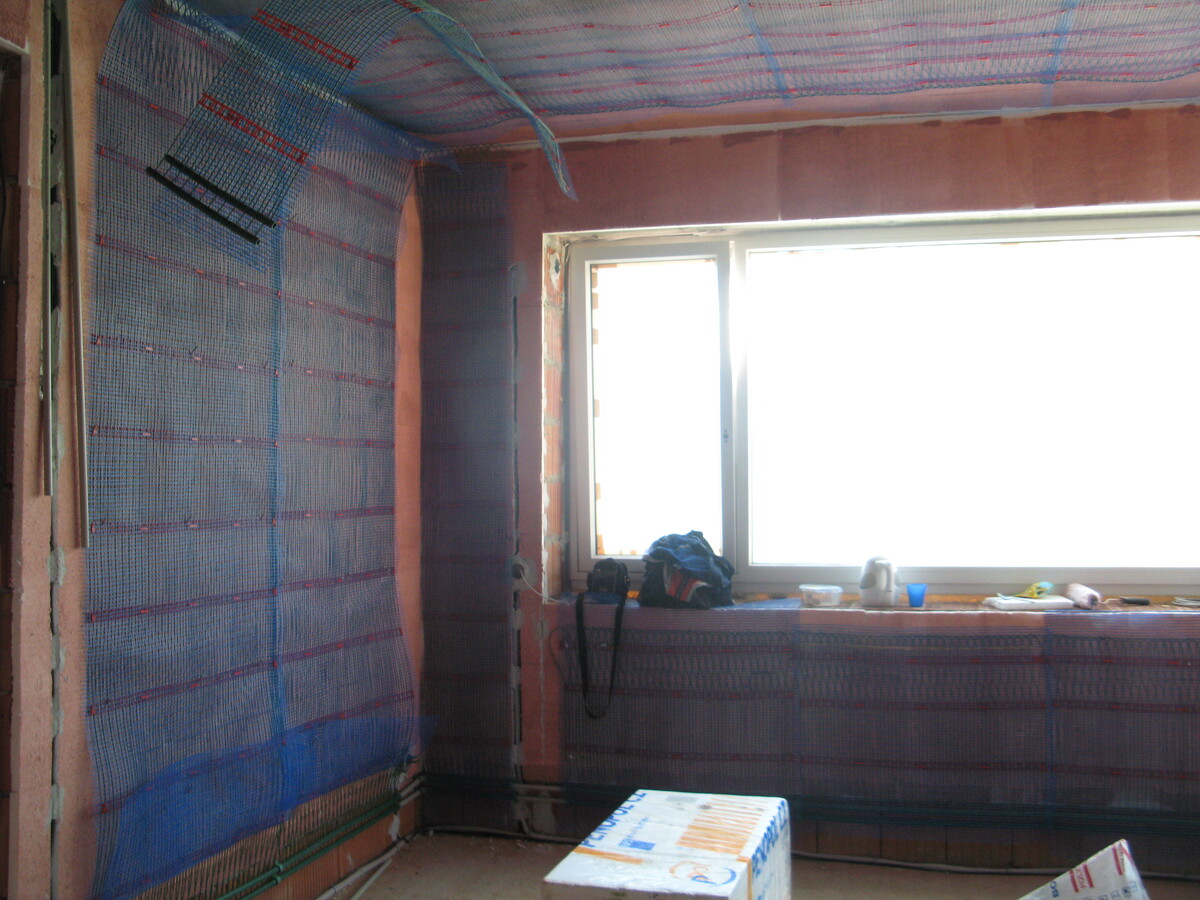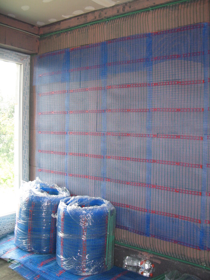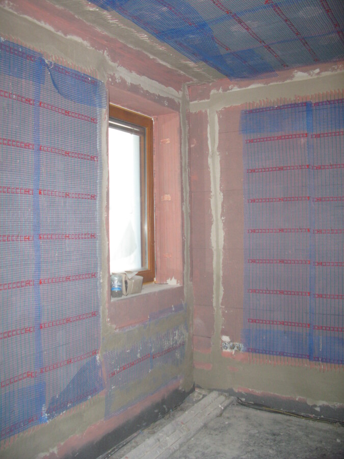 Plnoplošná instalace kapilárních rohoží, tepelné čerpdlo země/voda, zemní akumulátor pod základovou deskou, příprava pro solární kolektory.